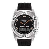 Tissot T002.520.17.051.02, Sport watch, Swiss quartz movement, Touch screen activation, Multifunction featuring chronograph, tide, lap, split, compass, alarm, timer, Black hands with luminous orange accents, Polished silver-tone markers with luminous orange accents, White indices, Brushed/polished stainless steel silver-tone bezel set with black engraved numbers, case, selector buttons and case back, Black polyurethane strap with a push button fold over deployment clasp, 100 meters/330 feet water resistant. ...